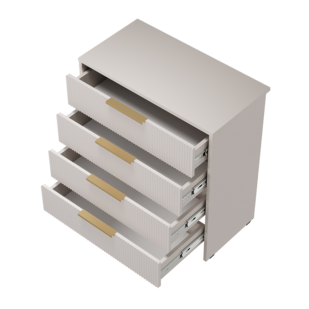 Лаконичный дизайн и отсутствие лишних деталей облегчают уход за комодом и делают его универсальным дополнением любого интерьера. Нежные оттенки фасада «айриш» и корпуса «кашемир» создают атмосферу уюта, а элегантная фрезеровка на фасаде добавляет модели изысканности и подчеркивает текстуру МДФ.