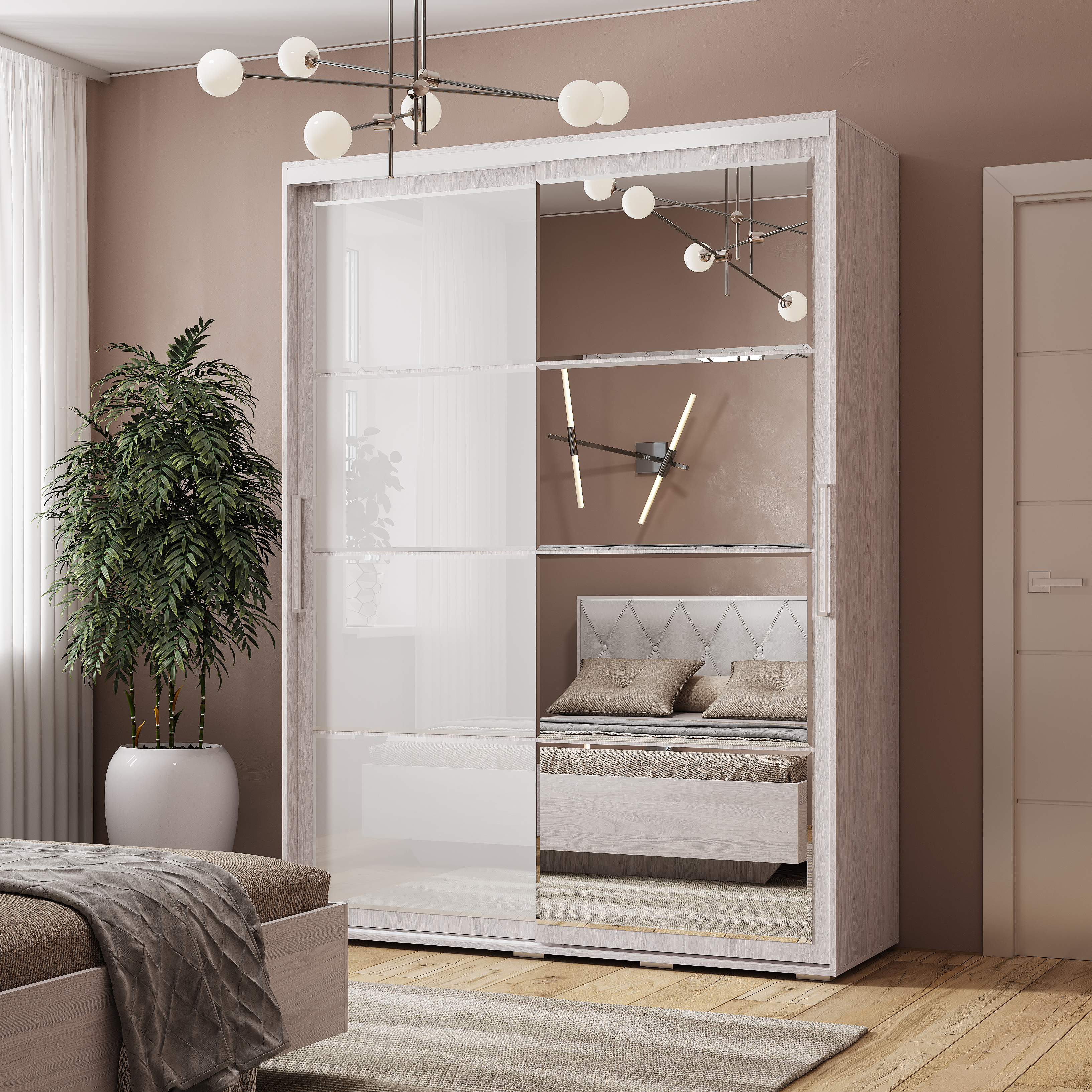 • Визуальное расширение пространства: Левая створка с зеркалами во весь рост добавляет комнате объема, света и глубины.