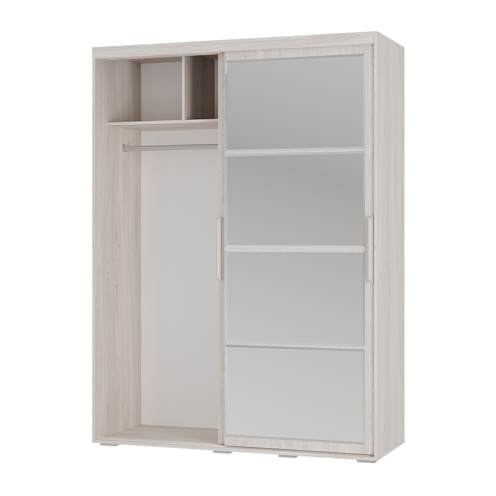 • Грамотное наполнение: Внутри предусмотрено всё необходимое — плательный отсек с хромированной штангой (772 мм), два выдвижных ящика, антресоль и вместительные полки.